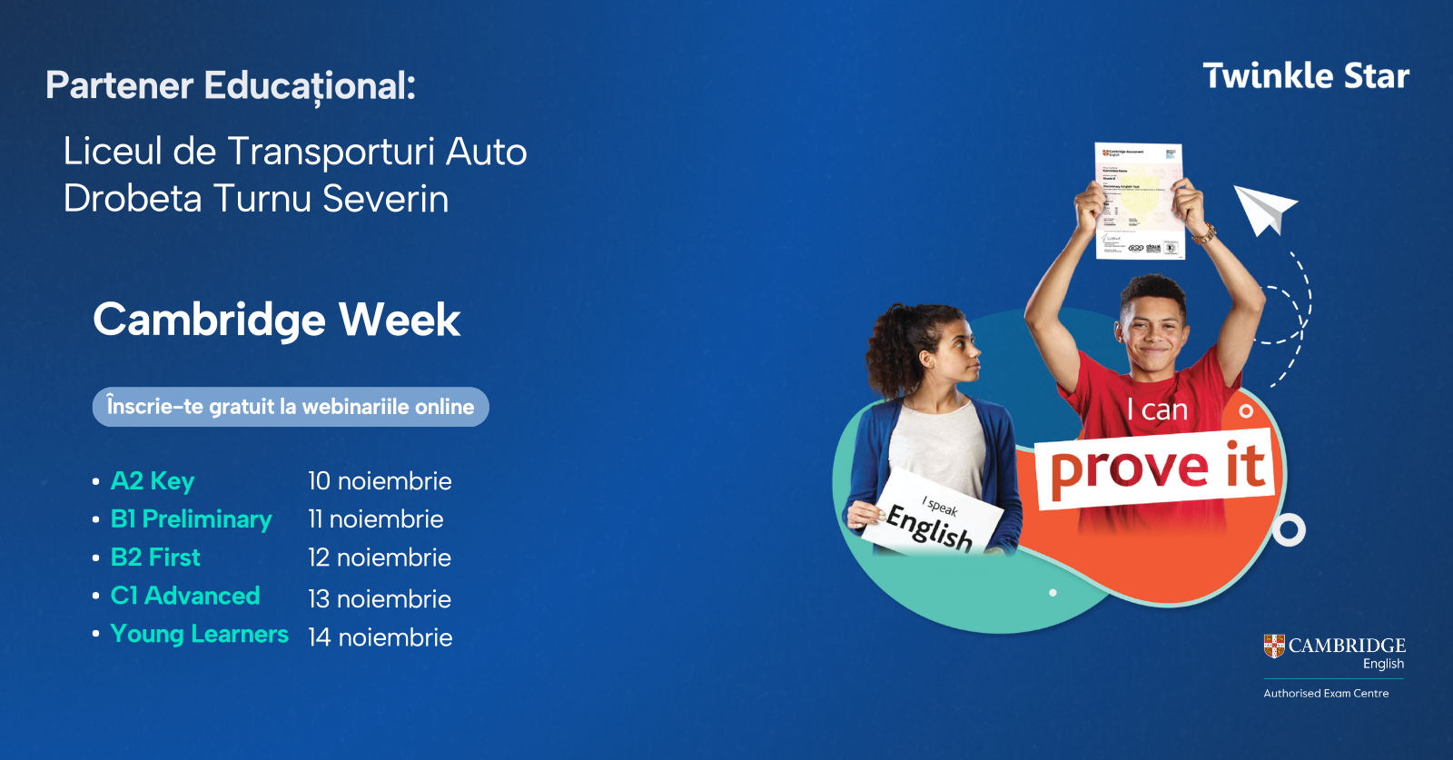 Suntem încântați să anunțăm parteneriatul nostru cu Twinkle Star – Cambridge English Educational Partner, în cadrul evenimentului CAMBRIDGE WEEK, o serie de webinarii interactive și gratuite, dedicate elevilor, părinților și profesorilor interesați de examenele Cambridge English.